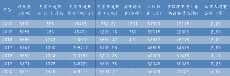 從表2可見,市容環(huán)衛(wèi)行業(yè)在2009年以后的發(fā)展可謂突飛猛進,從2009-2020年,全國垃圾清運量增加49.43%,相比1999-2009年間,增速提升了11.6個百分點;同一時期,無害化處理場數(shù)量增長126.98%,而前一個10年則是-18.53%;其他指標,垃圾無害化處理能力、垃圾無害化處理量、市容環(huán)衛(wèi)專用車輛設(shè)備總數(shù)均以倍速提升;公廁數(shù)量則增加了39.37%,而前一10年增速僅為10.70%。每萬人擁有的公廁數(shù)量是唯一一個下降的指標,考慮最近10年中國城市化的高速度,似乎也可以理解。最遺憾的還是糞便清運量,從2017年開始就無統(tǒng)計數(shù)據(jù),而歷史數(shù)據(jù)也是上下起伏不定。糞便處置不僅與廁所革命密切相關(guān),更關(guān)系到自然水體保護和食品安全,期待糞便處置能夠得到更多重視。《年鑒》顯示,2020年,全國縣城生活垃圾清運量達6810萬噸(約0.68億噸),總計擁有1428座無害化處理場(廠),生活垃圾處理能力358,319噸/日(約35.83萬噸/日),年無害化處理生活垃圾6691.32萬噸(約0.67億噸)??h城總計擁有公廁55,548座(5.55萬座),平均每萬人擁有公廁3.51座,全國縣城共擁有環(huán)衛(wèi)專用車輛設(shè)備74,722輛(約7.47萬輛)。表3 2000-2020年全國縣城市容環(huán)衛(wèi)總體情況(大致按年代跨度)