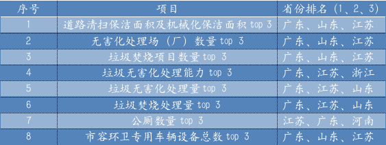 2、2020年環(huán)衛(wèi)設(shè)施投資大提速2020年市容環(huán)衛(wèi)和垃圾處理基礎(chǔ)設(shè)施固定資產(chǎn)投資1568.4億元,其中市容環(huán)衛(wèi)投資862.6億元,垃圾處理設(shè)施投資705.8億元,這兩個數(shù)字較2019年增長了54.75%和73.50%,目測是10年來增速最快的一年。環(huán)衛(wèi)真的是朝陽產(chǎn)業(yè)啊!3、有的省在環(huán)衛(wèi)和垃圾處理固定資產(chǎn)投資為0上文提到固定資產(chǎn)投資,全國花了1568個億,但也有個別省份交了白卷,例如西藏,在這兩方面的投資均為0,而青海,雖然在市容環(huán)衛(wèi)設(shè)施方面花了1個多億,但垃圾處理基礎(chǔ)設(shè)施投資也是0.有0就有top 5,2020年,在市容環(huán)衛(wèi)設(shè)施方面投資最大的省份是:廣東(102.2億)、江蘇(93.5億)、浙江(61.4億)、河南(59.4億)、河北(57.1億),垃圾處理設(shè)施建設(shè)方面投資最大的省份是:廣東(97.3億)、江蘇(84.6億)、浙江(53.8億)、河北(49.7億)、河南(48.3億)。是的,你沒看錯,前三沒有變化,只有第四和第五位是河南、河北在移形換位。如果沒有特殊情況,未來幾年內(nèi),這五個省的環(huán)衛(wèi)和垃圾處理設(shè)施投資會繼續(xù)名列前茅,相關(guān)企業(yè)需要重視了!4、全國市容環(huán)衛(wèi)實力哪家強?表5 全國市容環(huán)衛(wèi)行業(yè)主要指標排名前三位省份