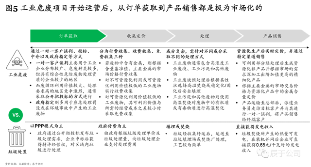 值得注意的是,工業(yè)危廢運營階段的競爭同樣十分激烈,從來料獲取到產(chǎn)品銷售都極為市場化(見圖5)。以訂單獲取為例,工業(yè)危廢往往需要通過一對一客戶談判、投標、中介以及政府指定等方式來展開,這與傳統(tǒng)的垃圾處置行業(yè)以PPP模式為主是截然不同的。