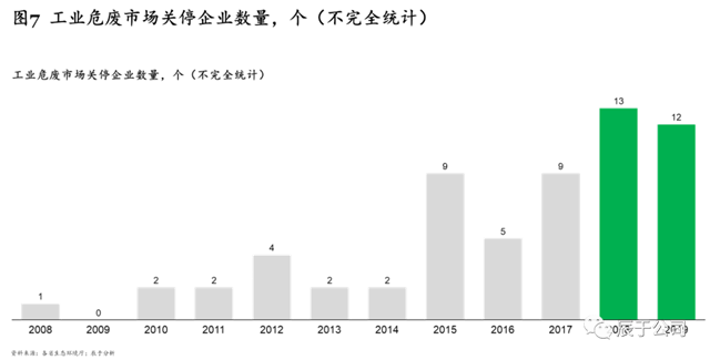 一是與市場需求種類不匹配,根據(jù)2019年最新修訂發(fā)布的《國家危險廢物名錄》,我國危險廢物分類共有46大類,471種,而我國90%以上危廢處置企業(yè)僅能處置5種或以下的危廢種類,供需種類錯配的現(xiàn)象較嚴重;二是產(chǎn)能落后,處置規(guī)模小,技術(shù)和使用設(shè)備落后,無法滿足污染防治的要求;三是安全隱患突出,環(huán)境管理水平低下以及相關(guān)危險廢物經(jīng)營安全的規(guī)章制度不完善,導(dǎo)致環(huán)境安全隱患問題突出??梢灶A(yù)見的是,隨著市場競爭日益激烈,“小而弱”的工業(yè)危廢企業(yè)將越來越難以適應(yīng)市場新要求,頻頻被“出清”。據(jù)不完全統(tǒng)計,2010-2014年,每年關(guān)停的工業(yè)危廢服務(wù)企業(yè)僅為2——4家,2018和2019年則分別達到了13和12家(見圖7)。