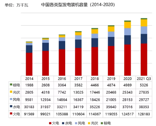 新能源的發(fā)展是《方案》中著力描寫的重要篇章。對于風電與太陽能發(fā)電,所采取的原則是“全面推進”;對于水電,開發(fā)的原則是“因地制宜”;對于核電,需要“積極安全有序發(fā)展”。此外,生物質發(fā)電、地熱能以及波浪能、潮流能、溫差能等新能源的開發(fā)利用也有所提及,也將成為我國近十年內(nèi)探索發(fā)展的重要領域。國家能源局最新數(shù)據(jù)顯示,截至2021年第3季度末,我國風電和太陽能發(fā)電合計裝機容量合計5.8億千瓦,距離《方案》中要求的到2030年風光發(fā)電總裝機容量達到12億千瓦以上還有超過一倍的差距。未來十年,風光發(fā)電的裝機容量需要達到每年近8.5%的增長,水電需要在十四五和十五五期間分別新增4000萬千瓦裝機,對應現(xiàn)有水電裝機容量合計共增長近20%,才能滿足我國碳達峰行動方案的目標要求。