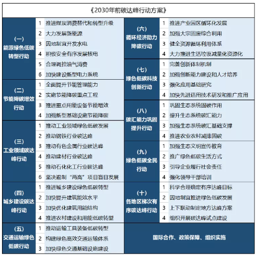 《2030年前碳達峰行動方案》作為我國對于碳達峰行動方案的總體規(guī)劃,提出了“碳達峰十大行動”,包含了43條具體工作內(nèi)容,對經(jīng)濟社會發(fā)展的各個領域構建了全面、細致且量化的行動方案和工作目標,對于十四五和十五五時期重點領域的細分政策出臺形成了重要的指引。行動方案的主要內(nèi)容如下表所示,包括上述的“碳達峰十大行動”以及國際合作、政策保障、組織實施三方面的保障措施。