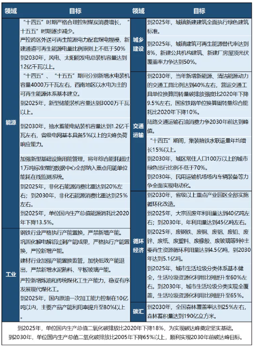由于《方案》中的十條行動內(nèi)容覆蓋我國碳達峰實現(xiàn)路徑上的方方面面,本文對《方案》中提到的約束性目標做出了簡要歸納,絕大多數(shù)目標均設定了量化的指標,對未來十年的關鍵領域發(fā)展具有極強的指引作用。具體內(nèi)容如下表所示。
