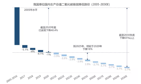 *圖內(nèi)數(shù)據(jù)為各年度我國單位GDP二氧化碳排放量同比變化的實際值和預測值。歷史數(shù)據(jù)來源于中華人民共和國2017-2020年國民經(jīng)濟和社會發(fā)展統(tǒng)計公報、生態(tài)環(huán)境部,預測數(shù)據(jù)由中財大綠金院根據(jù)《2030年前碳達峰行動方案》推算得出。
