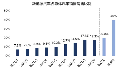 交通運輸領域則是要加快形成綠色低碳的運輸方式,主要行動集中于運輸工具裝備的低碳轉型、綠色化交運體系的構建以及綠色交通基礎設施的建設三個方面。對于運輸工具裝備的低碳轉型,我們看到《方案》明確提出了積極擴大電力、氫能、天然氣、先進生物液體燃料等新能源和清潔能源在交通運輸領域的應用,并對到2030年當年新增新能源、清潔能源動力的交通工具比例提出了達到40%左右的要求。根據(jù)汽車工業(yè)協(xié)會的統(tǒng)計數(shù)據(jù),2021年前9個月,各月新能源汽車銷售占總體比例呈現(xiàn)顯著的增長趨勢,到2021年8月,該比例已增長至超過17%,接近《新能源汽車產(chǎn)業(yè)發(fā)展規(guī)劃(2021—2035年)》中對2025年設置的20%的目標。未來十年內(nèi),按照《方案》的規(guī)劃,到2030年該比例還要增長一倍至40%左右。然而按照當前的趨勢來看,新能源車的加速發(fā)展可能比預期更快,可以期待到2030年,得益于新能源汽車的蓬勃發(fā)展,加之其他陸路交通工具的能效提升,帶動陸路交通運輸石油消費在2030年前達到峰值。