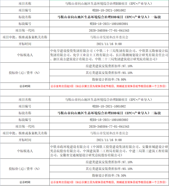 2021年11月17日,馬鞍山市公告資源交易中心發(fā)布《馬鞍山市向山地區(qū)生態(tài)環(huán)境綜合治理EOD項(xiàng)目(EPC+產(chǎn)業(yè)導(dǎo)入)項(xiàng)目中標(biāo)公示》。