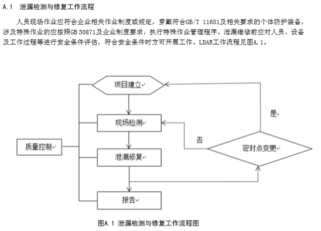 LDAR工作流程包括項(xiàng)目建立(資料收集、密封點(diǎn)識(shí)別、密封點(diǎn)檔案建立)、現(xiàn)場(chǎng)檢測(cè)和泄漏修復(fù)等 步驟。若企業(yè)因開停工、檢維修以及改擴(kuò)建等原因發(fā)生密封點(diǎn)變更的,需重新建立密封點(diǎn)檔案后開展現(xiàn) 場(chǎng)檢測(cè)和泄漏修復(fù)工作。LDAR工作流程按照附錄A進(jìn)行。