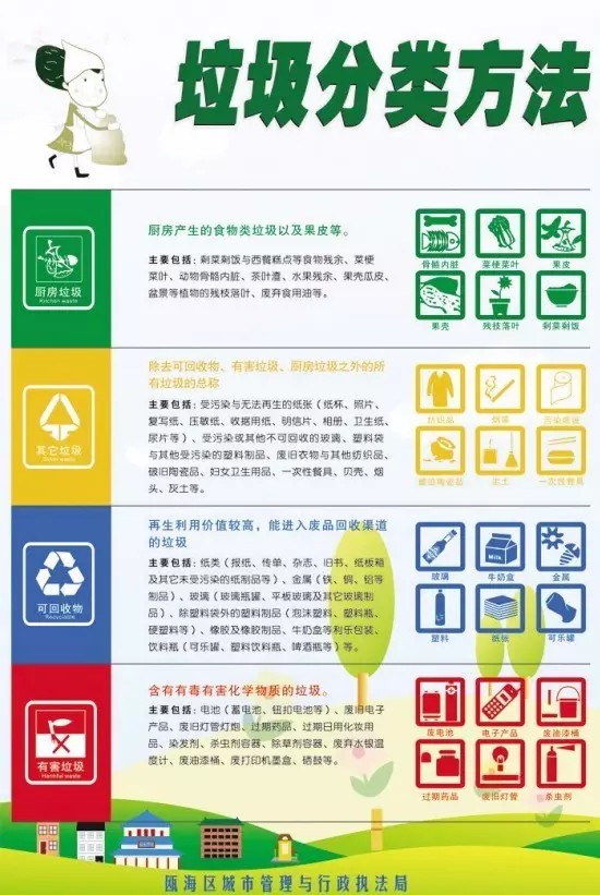 永康市在城鄉(xiāng)全面開(kāi)展了有害垃圾分類,電池、廢舊燈管燈泡、過(guò)期藥品、農(nóng)藥容器等不再混在普通生活垃圾中收集處理,而由超市、藥店和鄉(xiāng)鎮(zhèn)統(tǒng)一回收點(diǎn)回收,再定點(diǎn)集中銷毀。永康市農(nóng)辦干部丁維君說(shuō):“更精細(xì)化的分類,能在減量化、資源化利用的基礎(chǔ)上,進(jìn)一步提高無(wú)害化處理水平。”
