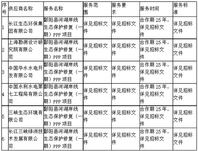 2021年11月23日,鄱陽縣河湖岸線生態(tài)保護修復(一期)PPP項目資格預審公告顯示,長江生態(tài)環(huán)保集團牽頭上??睖y設(shè)計研究院有限公司、中國華水水電開發(fā)有限公司、中國水利水電第七工程局有限公司、三峽生態(tài)環(huán)境有限公司和長江三峽綠洲技術(shù)發(fā)展有限公司中標。