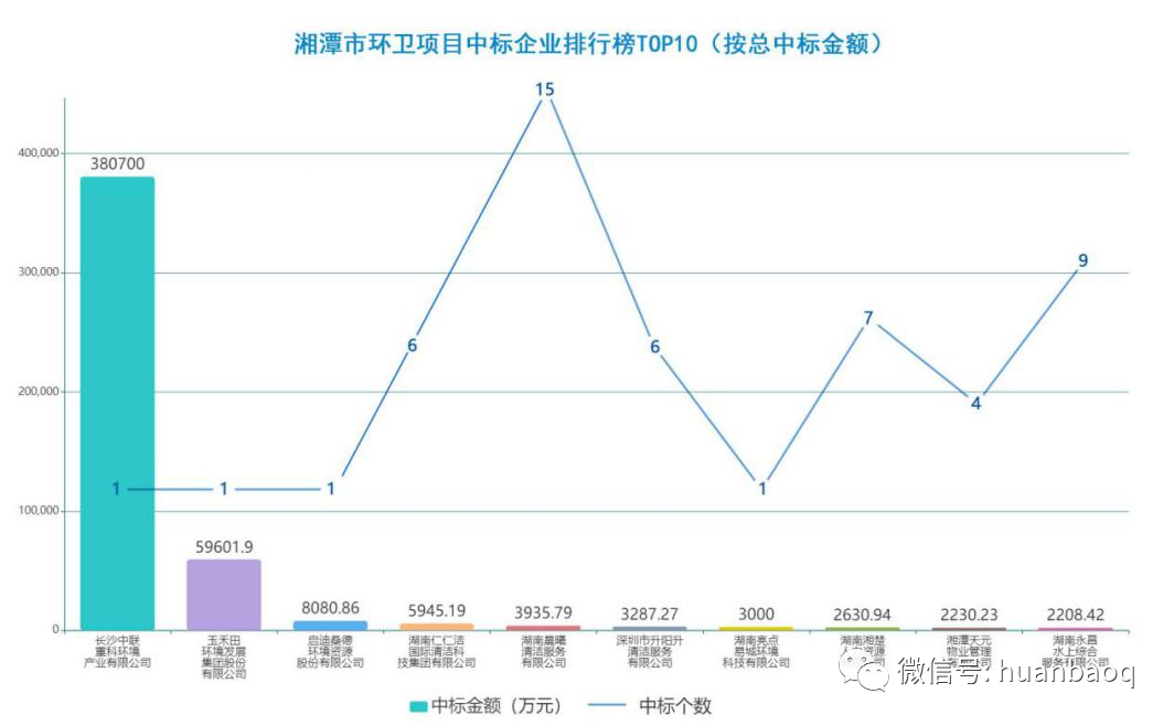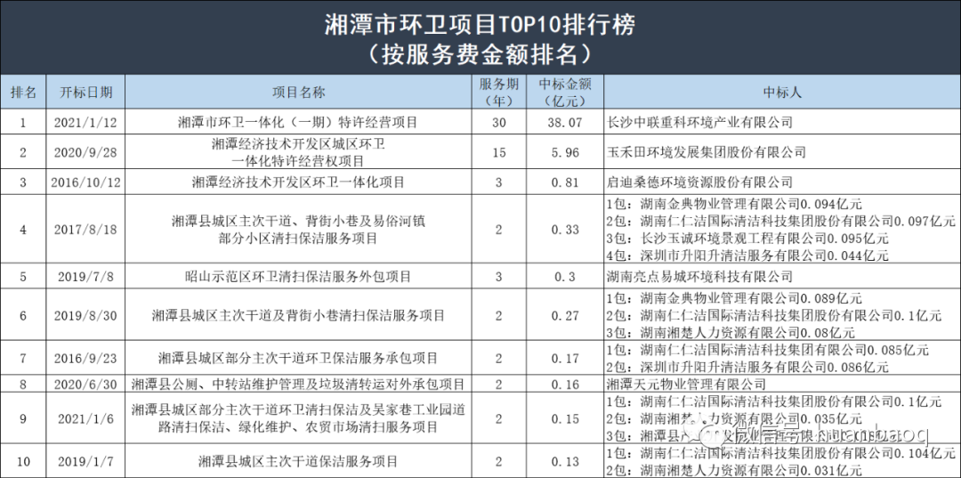 不過,換個角度,如果從中標金額看,盈峰中聯(lián)則是最大的勝利者,雖然只中標一個項目,但是服務費高達38.07億元,位列第一;第二和第三分別為玉禾田和啟迪桑德環(huán)境,中標金額分別為59601.9萬元和8080.86萬元,其實這兩家公司也僅僅中標了一個項目。? 首先值得注意的是本地“巨鱷”——長沙中聯(lián)重科環(huán)境產(chǎn)業(yè)有限公司。剛剛過去的8月21日,盈峰中聯(lián)發(fā)布了2021年半年度報告,營收54.48億元,歸母凈利潤3.71億元。報告期內(nèi),公司環(huán)衛(wèi)服務營業(yè)收入實現(xiàn)13.53億元,同比增長68.64%,成功突破廣州、蘇州、武漢、中山、三亞等15個地級市首次落地環(huán)衛(wèi)服務項目,市場開拓能力顯著。在湖南本地環(huán)衛(wèi)市場上,該公司今年也斬獲了多個億級項目:·2021年1月12日,中標湘潭市環(huán)衛(wèi)一體化(一期)特許經(jīng)營項目,項目特許經(jīng)營期限30年,總服務費約為38.07億元;·2021年5月31日,中標邵陽市新寧縣城鄉(xiāng)環(huán)衛(wèi)一體化項目特許經(jīng)營項目,合計投標總價4.81億元,服務期15年(含建設期1年);·2021年7月19日,中標湘西土家族苗族自治州鳳凰縣城鄉(xiāng)生活垃圾收轉(zhuǎn)運一體化服務采購項目,服務期限8年,總服務金額約為2.14億;中標價231元/噸,項目日轉(zhuǎn)運規(guī)模317.62噸(保底量設定為300噸/天,超出部分據(jù)實結(jié)算)。鑒于盈峰中聯(lián)在行業(yè)內(nèi)的強悍實力和湖南本土企業(yè)的地區(qū)優(yōu)勢,筆者預測未來很長時間內(nèi),他將持續(xù)稱霸湘潭市環(huán)衛(wèi)市場。根據(jù)2021年上半年年報,玉禾田營業(yè)收入約23.98億元,同比增長16.61%。此項數(shù)據(jù)已經(jīng)超過了該企業(yè)去年全年營收的一半。在湖南省環(huán)衛(wèi)市場上,玉禾田也有一定的收獲,中標的湘潭市項目是該地區(qū)唯二的億級環(huán)衛(wèi)項目:·2020年9月28日,中標湘潭經(jīng)濟技術(shù)開發(fā)區(qū)城區(qū)環(huán)衛(wèi)一體化特許經(jīng)營權(quán)項目,服務期15年,服務費5.96億元。·2021年4月21日,中標株洲市蘆淞區(qū)環(huán)衛(wèi)服務項目,中標金額為1.35億元,服務期3年。本項目分為9個包組,玉禾田中標包2,服務費3217.33萬元。作為一個外地企業(yè),玉禾田已經(jīng)在湖南省內(nèi)成功打開了局面,期待他有更好的表現(xiàn)。? 排名第三的是啟迪桑德環(huán)境資源股份有限公司。對湘潭市環(huán)衛(wèi)市場而言,啟迪環(huán)境入局時間很早。2016年10月12日,啟迪桑德環(huán)境中標湘潭經(jīng)濟技術(shù)開發(fā)區(qū)環(huán)衛(wèi)一體化項目,但此后,就再也未能見到該企業(yè)中標湘潭市環(huán)衛(wèi)項目的信息。近年來,啟迪環(huán)境常被負面信息纏身。根據(jù)啟迪環(huán)境2021年上半年業(yè)績預告,預計2021年上半年虧損33億元至40億元,相較于上年同期的盈利1.81億元,同比大降1927%—2315%。對啟迪環(huán)境來說,解決財務問題的最大的轉(zhuǎn)機或許是1月11日城發(fā)環(huán)境發(fā)布的擬換股吸收合并事件。啟迪環(huán)境是否能通過和城發(fā)“聯(lián)姻”緩解資金鏈危機?此次行業(yè)矚目的合作是否能有“實錘”?我們將拭目以待。此外,榜單中的湖南仁仁潔國際清潔科技集團有限公司、湖南晨曦清潔服務有限公司、湖南亮點易城環(huán)境科技有限公司均為湖南本地環(huán)衛(wèi)企業(yè)。湖南湘楚人力資源有限公司、湘潭天元物業(yè)管理有限公司都屬于非環(huán)衛(wèi)企業(yè),湖南永昌水上綜合服務有限公司則屬于水上運輸服務業(yè)。另外一點值得注意的是,目前榜首的10家企業(yè)均為私企,顯示地方國企在湘潭市環(huán)衛(wèi)市場上明顯發(fā)力不足。