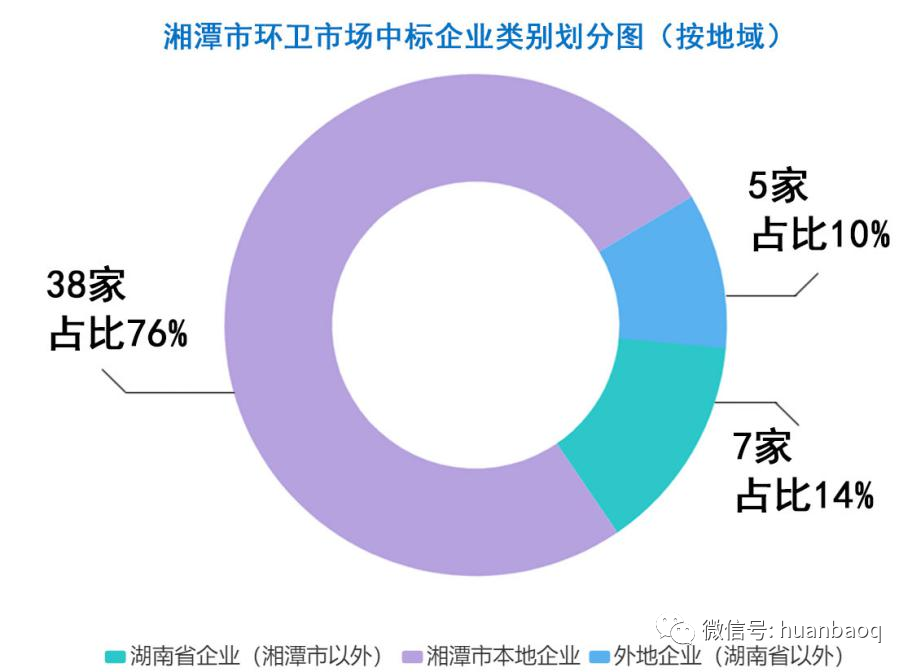 從下圖可以明顯看出,湘潭市環(huán)衛(wèi)市場本土化集中程度很高,50家企業(yè)中,湘潭市企業(yè)38家,約占企業(yè)總數(shù)的76%,另有7家湘潭市以外的湖南本土企業(yè)。