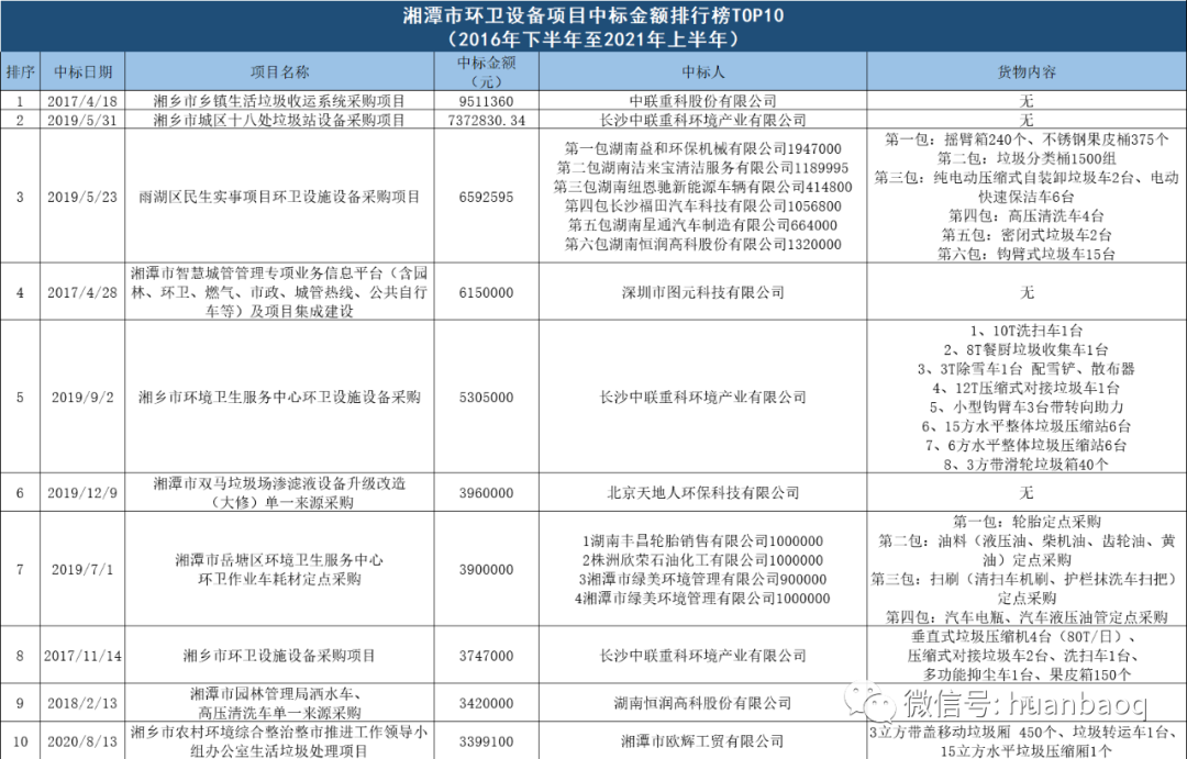 從上圖可以明顯看出,湘潭市2019年共發(fā)布38個環(huán)衛(wèi)裝備項目,總金額合計近6千萬,不論是項目個數(shù)還是總金額,都是2016年以來最高的一年。能查到中標金額的130個項目中,中標金額最高的是2017年4月18日開標的湘鄉(xiāng)市鄉(xiāng)鎮(zhèn)生活垃圾收運系統(tǒng)采購項目,中標金額951.14萬元,中標人為中聯(lián)重科股份有限公司,貨物內(nèi)容詳情并未公示。▼以下為湘潭市環(huán)衛(wèi)設備項目中標金額TOP10排行榜: