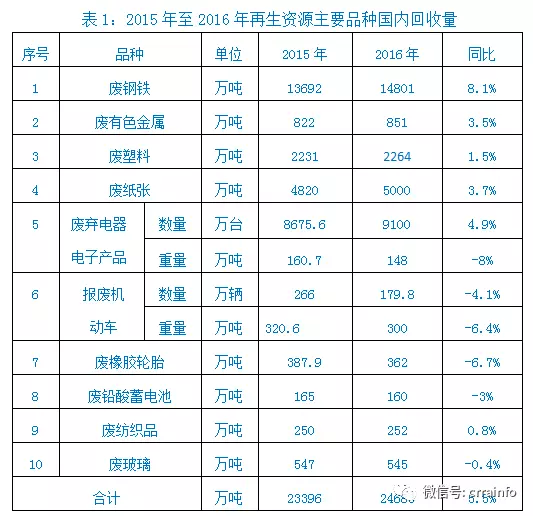 1、回收量。在宏觀經(jīng)濟(jì)形勢(shì)總體下行的背景下,再生資源回收行業(yè)總體規(guī)模不但沒(méi)有出現(xiàn)大幅下滑,而且有了一定幅度的增長(zhǎng)。據(jù)中再生協(xié)會(huì)統(tǒng)計(jì)顯示,2016年,廢鋼、廢有色金屬、廢塑料、廢紙、廢棄電器電子產(chǎn)品、報(bào)廢汽車、廢橡膠輪胎、廢鉛酸蓄電池、廢紡織品、廢玻璃等10個(gè)主要品種國(guó)內(nèi)回收量2.47億噸(見(jiàn)表1),比2015年同比增長(zhǎng)5.5%。