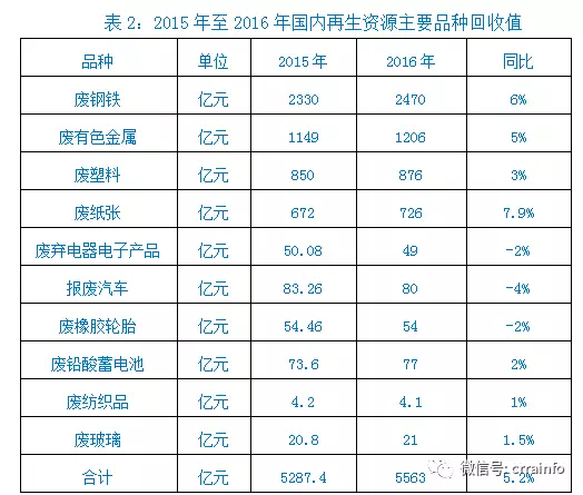 2、回收值。2016年,廢鋼、廢有色金屬、廢塑料、廢紙、廢棄電器電子產(chǎn)品、報(bào)廢汽車、廢橡膠輪胎、廢鉛酸蓄電池等10個(gè)主要品種國(guó)內(nèi)回收值5563億元(見(jiàn)表2),比2015年同比增長(zhǎng)5.2%,扭轉(zhuǎn)了近幾年回收值連續(xù)大幅下滑的趨勢(shì),實(shí)現(xiàn)了一定增長(zhǎng),提示著再生資源行業(yè)開(kāi)始進(jìn)入初春。