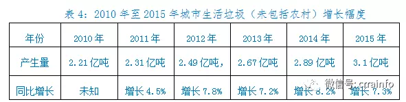 4、近五年全國(guó)城市生活垃圾增長(zhǎng)幅度。中再生協(xié)會(huì)專家組通過(guò)實(shí)地調(diào)研及查閱相關(guān)部門資料發(fā)現(xiàn),2010年,全國(guó)城市生活垃圾產(chǎn)生量2.21億噸,到2015年,全國(guó)城市生活垃圾產(chǎn)生量增長(zhǎng)到3.1億噸,5年間城市生活垃圾平均年增長(zhǎng)7.54%,其中2014年比2013年同比增長(zhǎng)8.2%(見(jiàn)表4)。