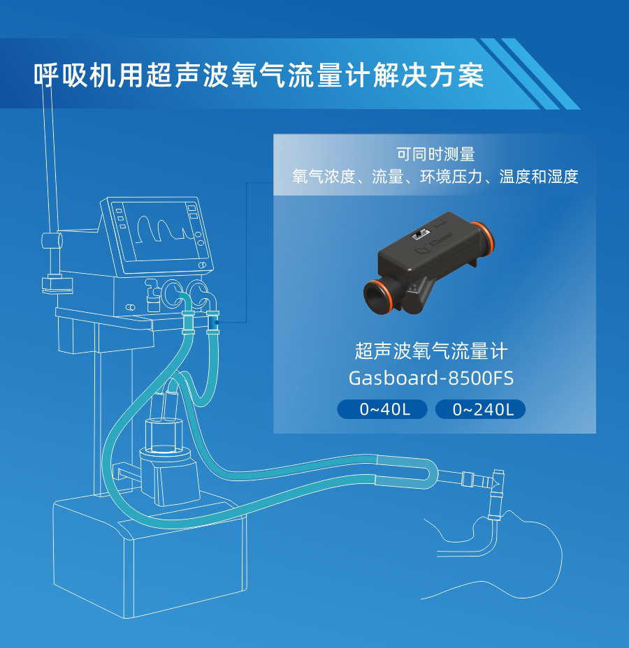 四方光電在健康醫(yī)療領域推出的Gasboard-8500FS超聲波氧氣流量計,可同時檢測氧氣的濃度、流量、壓力、溫度和濕度等指標,并通過串口或模擬信號輸出。傳感器具有生命周期內無零點漂移、響應快速、穩(wěn)定性好、精度高及壽命長等優(yōu)勢,接口按照ISO 5356設計,采用密封圈方式,更好的滿足客戶的安裝使用需求。目前Gasboard-8500FS流量可達240L/min,滿足呼吸機、麻醉機、高流量濕化治療儀等呼吸醫(yī)療設備的應用需求。