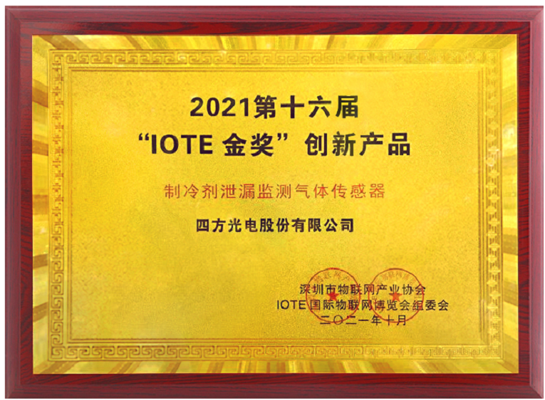 2021年10月,由中國物聯(lián)網產業(yè)應用聯(lián)盟、深圳市物聯(lián)網產業(yè)協(xié)會主辦的IOTE2021第十六屆深圳國際物聯(lián)網博覽會上,四方光電自主研發(fā)的制冷劑泄漏監(jiān)測氣體傳感器從上萬件產品中脫穎而出,被評為IOTE2021金獎創(chuàng)新產品。