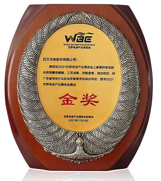 2021年11月,WBE2021世界電池產業(yè)博覽會暨第六屆亞太電池展在廣州廣交會展館C區(qū)隆重開幕。同期舉辦了2021世界電池之夜暨2021世界電池產業(yè)博覽會展品金獎頒獎典禮,四方光電自主研發(fā)的電池熱失控預警傳感器榮獲金獎。