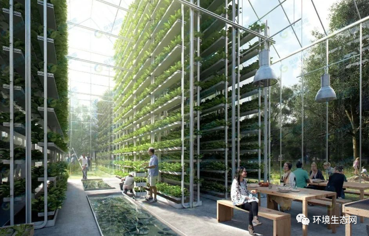 國外已經(jīng)開展了大量研究,綠色建筑的高級階段可以發(fā)展為 " 魚菜共生 " 系統(tǒng),使日常食物能夠在建筑內(nèi)實現(xiàn)并就近供應(yīng)。魚菜共生是一種新型的復(fù)合生態(tài)體系,它把水產(chǎn)養(yǎng)殖與水耕栽培兩種原本完全不同的農(nóng)耕技術(shù),通過巧妙的生態(tài)系統(tǒng)設(shè)計,達(dá)到在建筑內(nèi)科學(xué)的協(xié)同共生,從而實現(xiàn)養(yǎng)魚不換水而無水質(zhì)憂患,種菜不施肥而正常成長的生態(tài)共生效應(yīng)。采取 24 小時燈光照射促進(jìn)蔬菜生長,而且水的利用率可以達(dá)到 90% 以上。在這個案例中,樓頂單位面積的蔬菜產(chǎn)量是大田里的 50 倍左右,非常高效,很值得中國以城市為主導(dǎo)的 " 碳中和 " 體系學(xué)習(xí)。