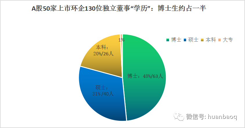 80%以上是碩博學(xué)歷,哪三類獨董最吃香?雖然獨董這個職位工資看起來不太高,風(fēng)險又很大,但它也不是人人都可以當(dāng)?shù)?,至少?個門檻:首先是學(xué)歷門檻,最低是本科,80%以上是碩士、博士。雖然《證券公司董事、監(jiān)事和高級管理人員任職資格監(jiān)管辦法》適當(dāng)將證券公司獨立董事放寬至大專,但是在實踐中,別說大專學(xué)歷,就連本科學(xué)歷在獨立董事一職中也沒啥競爭力。筆者統(tǒng)計了A股50家上市環(huán)企130位獨董發(fā)現(xiàn),有且只有一位是大專學(xué)歷(雪浪環(huán)境獨董孫新衛(wèi)),但他同時還擁有注冊會計師、注冊評估師、會計師、資產(chǎn)評估師等證書,一定程度上彌補了學(xué)歷上的不足。剩余的129個獨立董事,80%以上是碩士、博士,其中博士占據(jù)了半壁江山,甚至有些還是博士生導(dǎo)師。▼A股50家上市環(huán)企132位獨立董事學(xué)歷統(tǒng)計