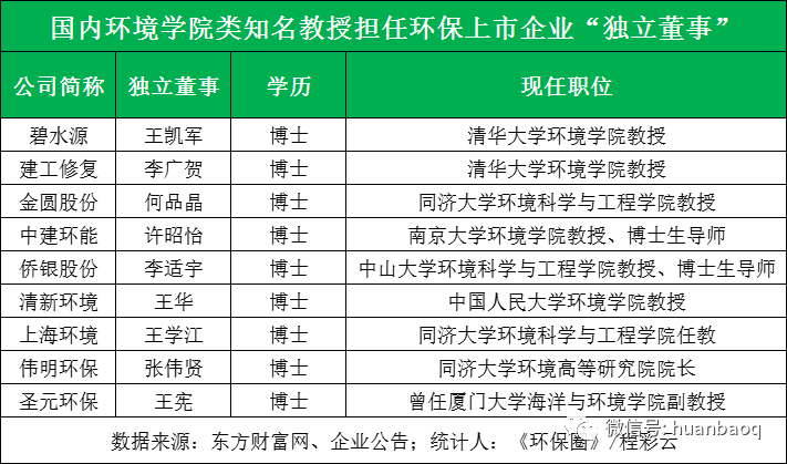 ? 第二,環(huán)境學(xué)院類知名教授。筆者還發(fā)現(xiàn)一個現(xiàn)象,有些環(huán)境院校的知名教授也兼職了獨立董事一職,不少還是業(yè)內(nèi)熟悉的面孔。比如業(yè)內(nèi)大咖王凱軍老師,既是碧水源的獨立董事,也是北控水務(wù)的獨立董事;再如同濟大學(xué)的何品晶老師,也是身兼數(shù)職,同時擔(dān)任金圓股份獨立董事、寶武集團環(huán)境資源科技董事、天津建昌環(huán)保董事等,還有中山大學(xué)教授李適宇也擔(dān)任著僑銀股份的獨立董事。▼擔(dān)任上市環(huán)企獨立董事一職的環(huán)境學(xué)院類教授