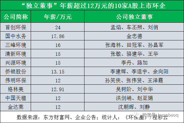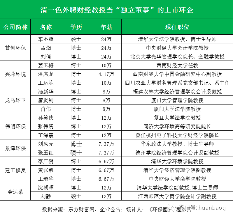 揭秘A股50家上市環(huán)企的132位獨董:簡單了解獨董職責(zé)之后,我們回歸環(huán)保行業(yè),談一談A股上市環(huán)企的獨立董事們。筆者查閱資料發(fā)現(xiàn),自從康美案落定后,A股上市環(huán)企中,還真有兩家上市環(huán)企獨董因個人原因提交了辭呈。一位是年薪僅5千元的富春環(huán)保獨立董事林潔,另一位是新三板公司博芳環(huán)保的獨立董事陳麗紅。兩個人都是因為“個人原因”提交的辭呈,巧合的是,辭職的時間都是在康美處罰案落地前后。排除這兩家之外,《環(huán)保圈》發(fā)現(xiàn),A股上市環(huán)企絕大多數(shù)獨立董事都比較淡定,沒有在敏感時期提出辭職。為了讓讀者進一步了解上市環(huán)企獨董的背景,《環(huán)保圈》對A股50家上市環(huán)企中132位獨立董事進行了逐一統(tǒng)計,從而進一步觀察他們年薪、學(xué)歷、背景、從業(yè)經(jīng)歷。首先,每家上市環(huán)企外聘的獨立董事數(shù)量幾乎是一樣的,都是3-4個。這跟證監(jiān)會要求有關(guān),“上市公司獨立董事人數(shù)不得少于董事會成員的1/3”。由于環(huán)保上市企業(yè)本身規(guī)模不大,董事會成員大多在10人左右,所以匹配3-4個獨立董事最為合適。其次,從薪資上看,每家企業(yè)外聘獨立董事的工資也是不一樣的。最高的當(dāng)屬首創(chuàng)環(huán)保,分別給予孟焰、車丕照、劉俏教授年薪24萬/年;其次是國中水務(wù),其獨立董事金忠德薪酬17.86萬元/年;再者還有三峰環(huán)境、清新環(huán)境、興源環(huán)境、偉明環(huán)保、僑銀股份、格林美,中國天楹、金達(dá)萊等,這幾家企業(yè)對獨董也非常大方,年薪都在12萬/年以上,平均每月收入1萬元左右。