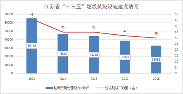以江蘇省“十三五”垃圾焚燒建設(shè)為例,“十三五”時期,江蘇省城市生活垃圾處理設(shè)施較“十二五”新增15座,日處理能力翻了一倍,特別是2018年后,增幅明顯,這與《江蘇省環(huán)境基礎(chǔ)設(shè)施三年建設(shè)方案(2018——2020年)》印發(fā),組織實施一系列重點工程有關(guān)。按照《江蘇省“十四五”生態(tài)環(huán)境保護(hù)規(guī)劃》,“十四五”全省無害化能力僅計劃新增2萬噸/日,餐廚廢棄物處理能力計劃新增2000噸/日。