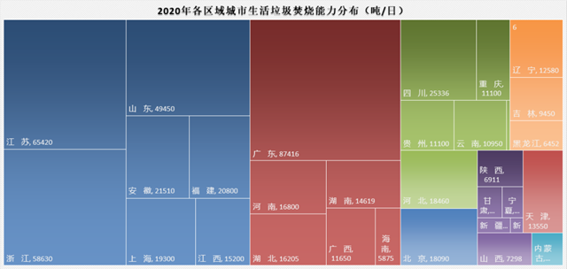 如果從無害化處理能力來看,又是另一番景象。廣東、山東、江蘇、浙江四省無害化處理能力仍然領(lǐng)跑,其中垃圾焚燒處理能力分別達(dá)到87416噸/日、49450噸/日、65420噸/日、58630噸/日??梢钥吹脚判蚵杂凶兓?,江蘇、浙江的垃圾焚燒處理能力高于山東省,推算如果論平均單體垃圾焚燒項目規(guī)模,江蘇和浙江省高于山東省。數(shù)據(jù)中還可以看到,這幾個省份是大力發(fā)展生活垃圾焚燒的省份,不僅焚燒廠建得多,而且垃圾焚燒日處理能力和處理量也處在突出高位。