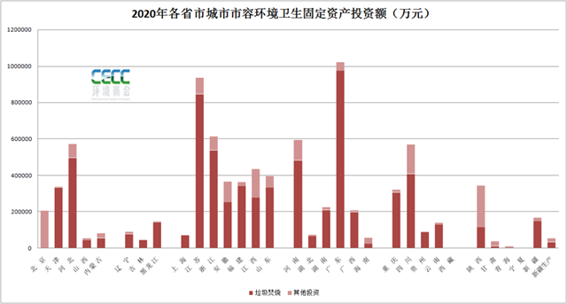 從區(qū)域來看,2020年,廣東(97.3億元)、江蘇(84.6億元)、浙江(53.7億元)以及河北(49.7億元)、河南(48.3億元)等地環(huán)境市容衛(wèi)生設(shè)施建設(shè)投入較大,其中大部分資金用于垃圾處理設(shè)施建設(shè)。整個“十三五”時期,北京、廣東、江蘇等地城市環(huán)境衛(wèi)生固定資產(chǎn)投資較大,其中北京五年的投資額接近400億,特別是2016年、2017年兩年,投資額均在百億以上。