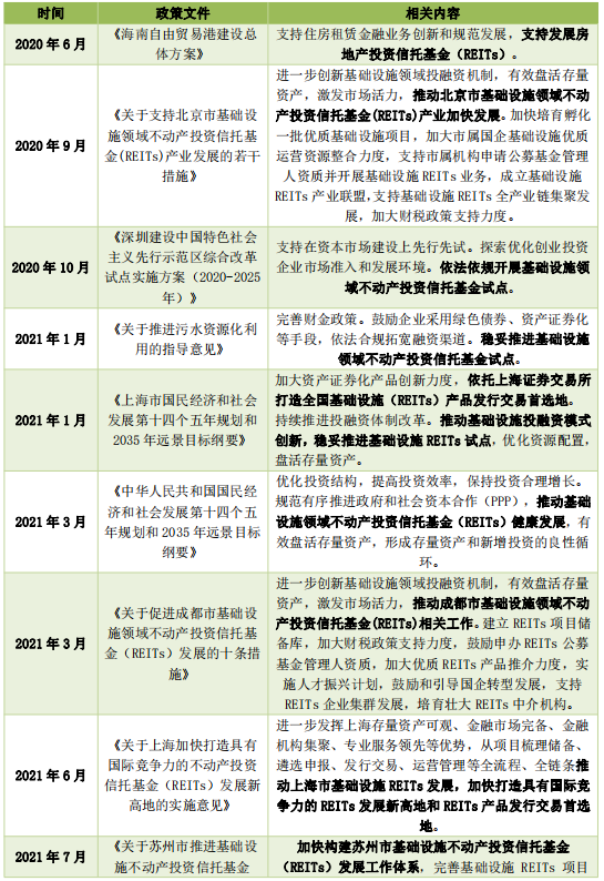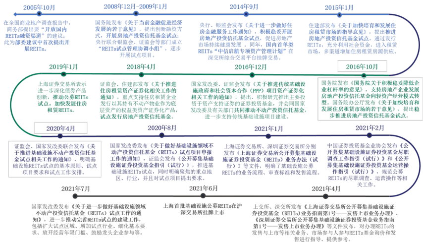 2016年3月,《國(guó)務(wù)院批轉(zhuǎn)國(guó)家發(fā)展改革委關(guān)于2016年深化經(jīng)濟(jì)體制改革重點(diǎn)工作意見的通知》提出,支持開展基礎(chǔ)設(shè)施資產(chǎn)證券化試點(diǎn),研究制定房地產(chǎn)投資信托基金規(guī)則,積極推進(jìn)試點(diǎn)。同年12月,國(guó)家發(fā)改委、證監(jiān)會(huì)發(fā)布《關(guān)于推進(jìn)傳統(tǒng)基礎(chǔ)設(shè)施政府和社會(huì)資本合作(PPP)項(xiàng)目資產(chǎn)證券化相關(guān)工作的通知》,推動(dòng)不動(dòng)產(chǎn)投資信托基金,充分依托資本實(shí)施積極推進(jìn)符合條件的PPP項(xiàng)目通過資產(chǎn)證券化的方式實(shí)現(xiàn)市場(chǎng)化融資,從而進(jìn)一步支持傳統(tǒng)基礎(chǔ)設(shè)施項(xiàng)目建設(shè)。2017年6月,財(cái)政部、中國(guó)人民銀行、證監(jiān)會(huì)聯(lián)合發(fā)布《關(guān)于規(guī)范開展政府和社會(huì)資本合作項(xiàng)目資產(chǎn)證券化有關(guān)事宜的通知》,推動(dòng)不動(dòng)產(chǎn)投資信托基金發(fā)展,鼓勵(lì)各類市場(chǎng)資金投資PPP項(xiàng)目資產(chǎn)證券化產(chǎn)品。2019年1月,上海證券交易所表示進(jìn)一步深化債券產(chǎn)品創(chuàng)新,推動(dòng)公募REITs試點(diǎn),公募REITs試點(diǎn)階段正式開啟。