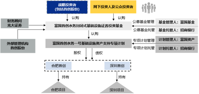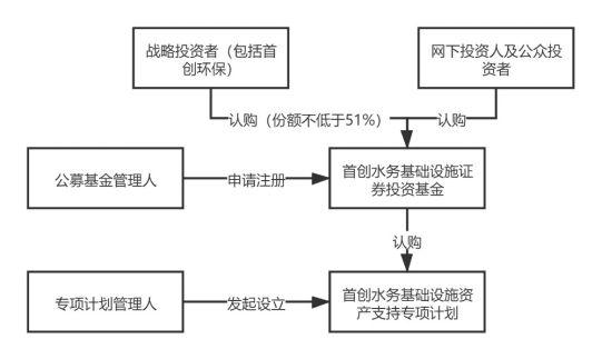 其次,由富國資產(chǎn)作為專項計劃管理人設(shè)立首創(chuàng)水務(wù)基礎(chǔ)設(shè)施資產(chǎn)支持專項計劃,首創(chuàng)水務(wù)基礎(chǔ)設(shè)施證券投資基金設(shè)立后以募集資金認購資產(chǎn)支持專項計劃全部份額,專項計劃完成設(shè)立。