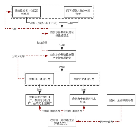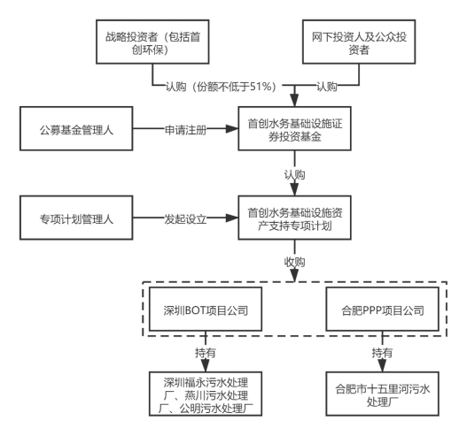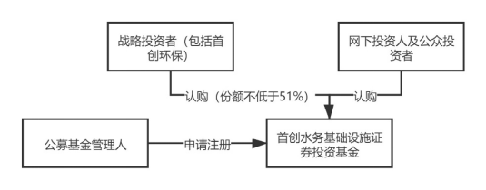 具體實施步驟為:首先,公募基金管理人富國基金向證監(jiān)會申請注冊首創(chuàng)水務(wù)基礎(chǔ)設(shè)施證券投資基金,取得注冊文件后,富國基金將基礎(chǔ)設(shè)施證券投資基金進行公開發(fā)售,其中首創(chuàng)環(huán)?;蚱渫豢刂葡玛P(guān)聯(lián)方作為戰(zhàn)略配售投資人參與認購比例不低于本次基金份額發(fā)售數(shù)量的51%(實際發(fā)行時認購比例為51%)。