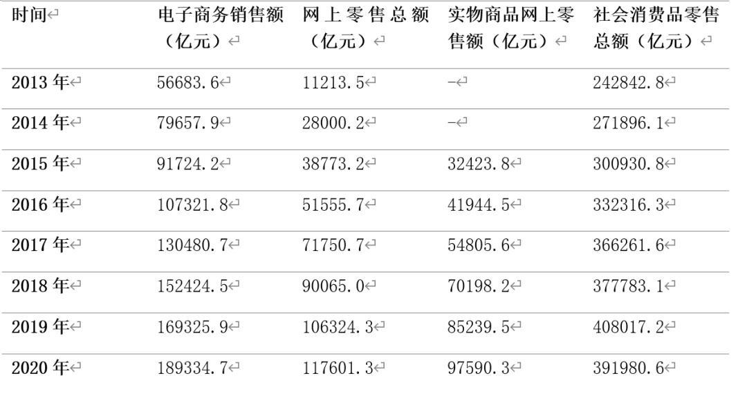 近年來我國互聯(lián)網(wǎng)產(chǎn)業(yè)呈現(xiàn)高速發(fā)展態(tài)勢,網(wǎng)民數(shù)量與互聯(lián)網(wǎng)普及率不斷增長,為網(wǎng)絡(luò)購物奠定了龐大的用戶基礎(chǔ)。數(shù)據(jù)顯示,截至2020年3月,我國網(wǎng)民規(guī)模達(dá)9.04億人,互聯(lián)網(wǎng)普及率為64.5%,較2018年底提升4.9個百分點。與此同時,電子商務(wù)市場規(guī)模也在不斷增長。2020年,電商領(lǐng)域總就業(yè)人數(shù)達(dá)到6015萬,較2019年增長約17.35%,預(yù)計到2025年將達(dá)到7000萬人。此外,2021年上半年,我國電商用戶達(dá)8.12 億,較2020年12月增長2965萬。2020年網(wǎng)上零售額為11.76萬億元,是2013年的10.5倍,占社會消費品零售額的比重由2013年的5%增長到2020年的30%?!?021年中國電商年度發(fā)展報告》顯示,今年前三季度我國網(wǎng)上零售額達(dá)9.19萬億元,同比增長18.5%。