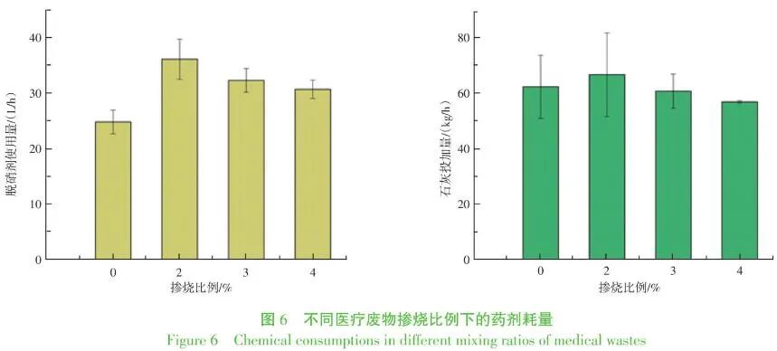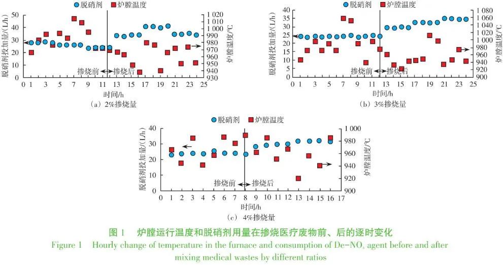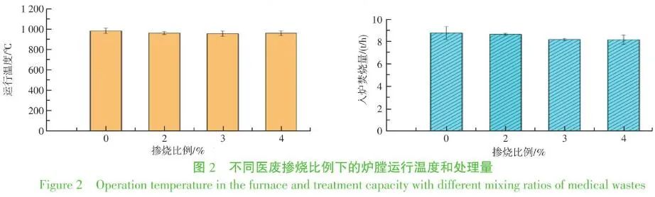 這里主要關(guān)注醫(yī)療廢物摻燒對焚燒爐爐膛溫度和焚燒處理量的影響。圖1給出每個摻燒比例前后的爐膛溫度和脫硝劑用量的逐時變化。其中摻燒比例為2%和3%(wt)時,前12 h為日常運行情況,后12 h為摻燒后的代表性工況;摻燒比例為4%(wt)時,前8 h為日常運行情況,后8 h為摻燒后的代表性工況。將上述逐時溫度按照不同醫(yī)療廢物添加量工況取平均值,結(jié)果見圖2,圖2同時給出了實際的入爐垃圾焚燒量。可見,日常運行爐膛內(nèi)溫度較高,平均可達982.72 ℃,在摻燒醫(yī)療廢物后爐膛溫度略有降低,這可能是由于供風量隨著醫(yī)療廢物摻燒比例的增加而增大引起的變化,但是不同摻燒比例下運行溫度變化不大,無顯著性差異,總體上運行溫度在正常波動范圍內(nèi),并高于850 ℃。