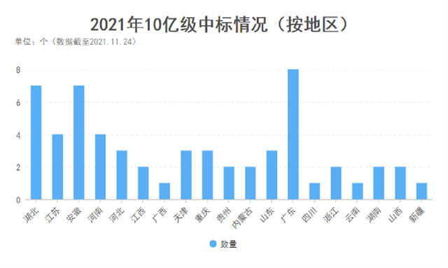 而從區(qū)域來看,廣東、湖北、安徽10億+標(biāo)的數(shù)量名列前三,江蘇、河南、河北、天津、重慶、山東等也有數(shù)個(gè)10億+標(biāo)的被拿下,區(qū)域市場熱度可見一斑。