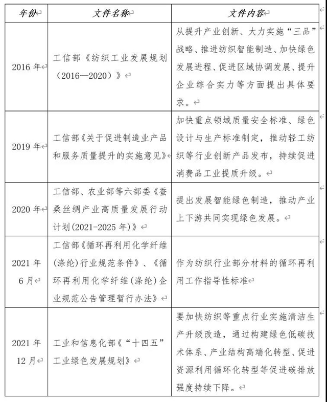 國(guó)家政策層面,自2016年起工信部聯(lián)合各部委陸續(xù)發(fā)布多個(gè)工業(yè)、制造業(yè)高質(zhì)量發(fā)展實(shí)施意見(jiàn),其中多次提到紡織行業(yè)作為重要領(lǐng)域,要加快綠色制造、綠色設(shè)計(jì),推動(dòng)行業(yè)循環(huán)再利用,促進(jìn)行業(yè)高質(zhì)量綠色發(fā)展。