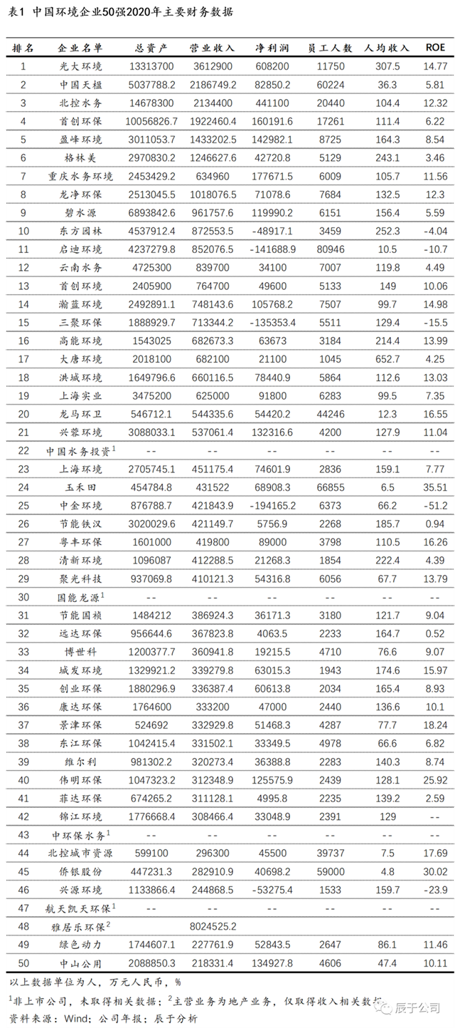 2021年7月全國工商聯(lián)環(huán)境商會發(fā)布了最新一期的中國環(huán)境企業(yè)50強榜單,辰于對榜單中企業(yè)的主要財務數(shù)據(jù)(見表 1)進行統(tǒng)計發(fā)現(xiàn),光大環(huán)境高居榜首收入達到361億元,超過第二名65%;企業(yè)需要收入超過21億元才能進入50強,超過87億元才能進入前10強;由于主營業(yè)務差異,各企業(yè)在人均收入、ROE等指標上也有較大差距,環(huán)衛(wèi)行業(yè)的企業(yè)人均收入都比較低,其他領域的人均收入平均150萬元左右。