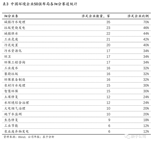 更細分去看,城鎮(zhèn)污水處理、垃圾焚燒發(fā)電、城鎮(zhèn)供水、工業(yè)危廢等是中國環(huán)境企業(yè)50強布局最多的細分領域(見表3),這些領域基本都是規(guī)模上千億甚至數(shù)千億的市場,“盤子”足夠大,商業(yè)模式穩(wěn)定,是環(huán)境強企必爭之地。