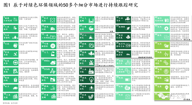 作為一家聚焦于綠色發(fā)展領域的專業(yè)咨詢機構,結合以往項目經驗以及業(yè)內習慣,辰于對綠色環(huán)保行業(yè)范圍進行了明確劃分,目前已經持續(xù)跟蹤50多個細分領域(見圖1)。有意思的一點是,過去的環(huán)保行業(yè)范圍一般是指包含供水、各類污染物末端處置和治理以及環(huán)境監(jiān)測在內的傳統(tǒng)環(huán)保領域,雙碳戰(zhàn)略提出后,當人們談到“環(huán)保”時,更多是指“綠色環(huán)保”的概念,節(jié)能、清潔能源、雙碳業(yè)務等行業(yè)也被納入。