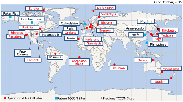溫室氣體地基遙感探測的典型方法是高分辨率的FTIR技術(shù),監(jiān)測波段主要位于近紅外4000~11000cm-1波段,光譜分辨率可高達(dá)0.0095cm-1,它具有高精度、高準(zhǔn)確性以及連續(xù)測量等優(yōu)勢,但高分辨的地基FTIR也具有相對較大的設(shè)備體積,建設(shè)成本較高。地基高分辨率FTIR光譜儀,簡稱FTS。目前,全球碳柱總量觀測網(wǎng)(TCCON),就是基于FTS觀測平臺,探測多種大氣溫室氣體的柱總量和垂直廓線,主要組分包括CO2、CH4、N2O、CO、H2O、HDO。該網(wǎng)絡(luò)建立了嚴(yán)格的數(shù)據(jù)采集與反演標(biāo)準(zhǔn),可用于研究全球的碳循環(huán),也可為衛(wèi)星的校準(zhǔn)提供標(biāo)準(zhǔn)數(shù)據(jù)庫。目前TCCON在全球已有二十多個站點(diǎn),具體分布如下圖3所示。