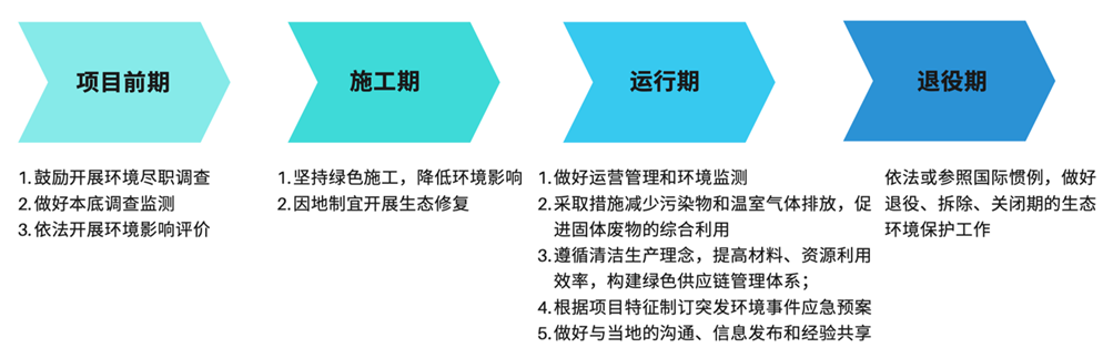 與2013版相比,2022版《指南》延續(xù)了2021版《工作指引》所鼓勵(lì)的“全周期”管理的精神,針對(duì)對(duì)外投資合作建設(shè)項(xiàng)目全生命周期中的每一個(gè)階段,包括項(xiàng)目前期、施工期、運(yùn)行期、退役期,都提出了具體的要求(見圖3)。其中,對(duì)每個(gè)階段的指引不僅涉及了污染防治、應(yīng)對(duì)氣候變化、生物多樣性保護(hù)等多維度,而且對(duì)標(biāo)了國(guó)際通行規(guī)則標(biāo)準(zhǔn)或中國(guó)更嚴(yán)格標(biāo)準(zhǔn)。