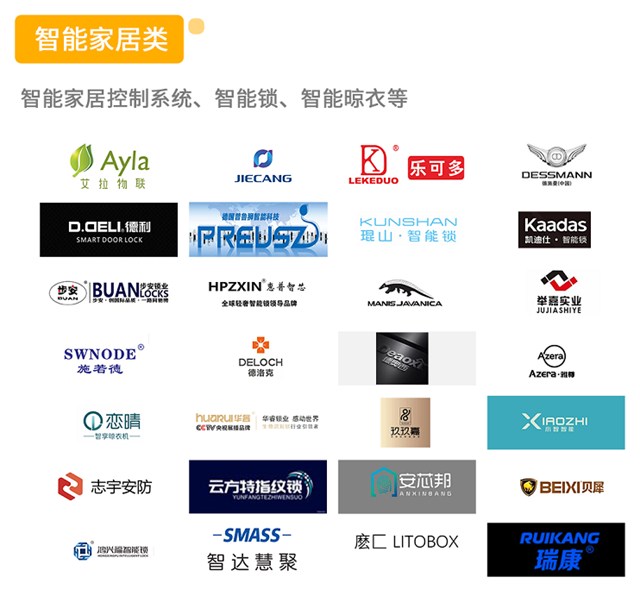 智能家居展區(qū)規(guī)劃在3-4號(hào)連接館集中展示,作為行業(yè)目前最熱門板塊,展品范圍涵蓋智能鎖、智能晾衣機(jī)、智能家居系統(tǒng)等,目前入駐部分品牌有:艾拉物聯(lián)(Ayla)、么匚(LITOBOX)、樂可多智能鎖、凱迪仕智能鎖、德利智能鎖、施若德智能鎖、德施曼智能鎖、步安鎖業(yè)、惠普智芯、舉嘉實(shí)業(yè)、戀晴、德洛克、雅尊、穿山甲智能鎖、鎖貿(mào)通展團(tuán)等共計(jì)86家智能行業(yè)企業(yè)已報(bào)名參展。