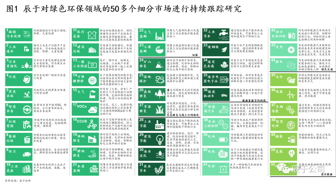 作為一家聚焦于綠色發(fā)展領域的專業(yè)咨詢機構,結合以往項目經(jīng)驗以及業(yè)內習慣,辰于對綠色環(huán)保行業(yè)范圍進行了明確劃分,目前已經(jīng)持續(xù)跟蹤50多個細分領域(見圖1)。有意思的一點是,過去的環(huán)保行業(yè)范圍一般是指包含供水、各類污染物末端處置和治理以及環(huán)境監(jiān)測在內的傳統(tǒng)環(huán)保領域,雙碳戰(zhàn)略提出后,當人們談到“環(huán)?!睍r,更多是指“綠色環(huán)?!钡母拍睿?jié)能、清潔能源、雙碳業(yè)務等行業(yè)也被納入。