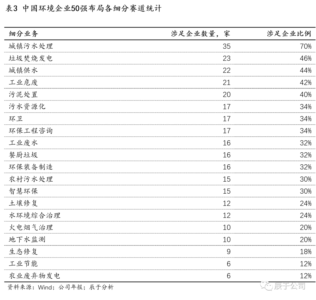 更細分去看,城鎮(zhèn)污水處理、垃圾焚燒發(fā)電、城鎮(zhèn)供水、工業(yè)危廢等是中國環(huán)境企業(yè)50強布局最多的細分領域(見表3),這些領域基本都是規(guī)模上千億甚至數(shù)千億的市場,“盤子”足夠大,商業(yè)模式穩(wěn)定,是環(huán)境強企必爭之地。