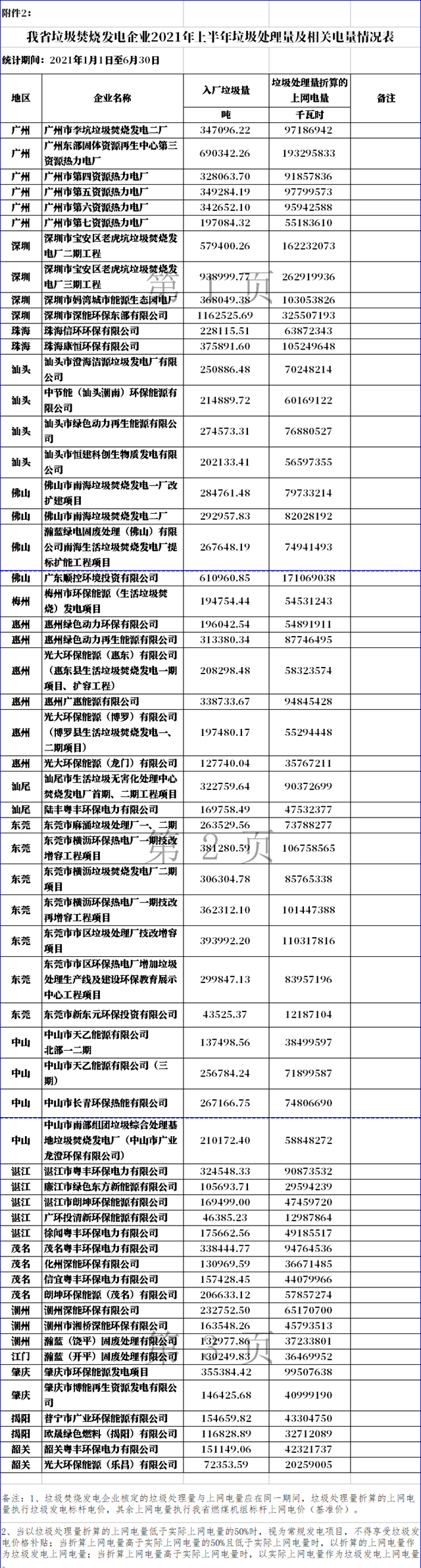 廣東:垃圾焚燒發(fā)電企業(yè)2020年下半年和2021年上半年垃圾處理量及相關(guān)電量情況發(fā)布