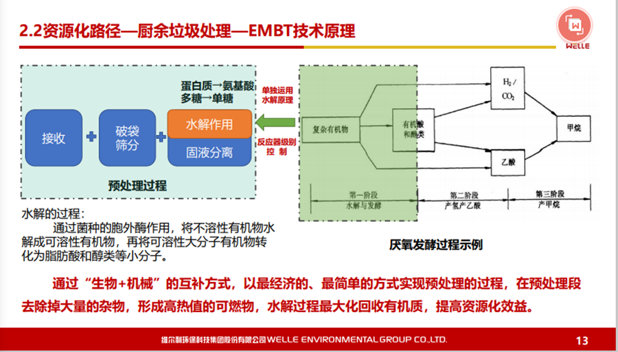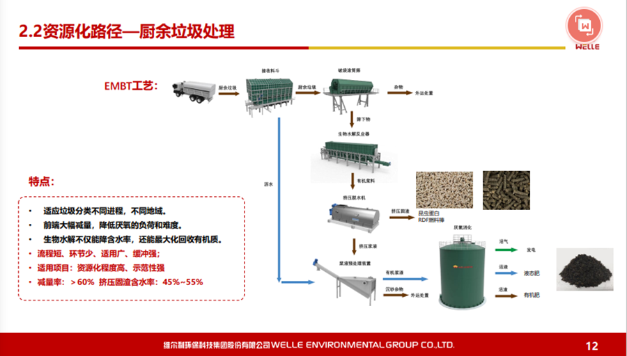 對于有機廢棄物的原料及核心技術(shù),可以說從城市有機廢棄物到農(nóng)村有機廢棄物,現(xiàn)在最核心的還是通過厭氧發(fā)酵技術(shù),最終通過沼氣化利用,達到無害化或者是環(huán)?;俦M可能實現(xiàn)資源化。國家發(fā)改委推出了一百個餐廚垃圾處理試點項目,之后進行全方位地推出。在國內(nèi)真正運行好的餐廚垃圾項目并不是特別多,主要工藝還是以厭氧為主。為什么這塊資源化的效率會好一些?尤其在“碳減排”的壓力下,使得出口價格一直比較好,這個行業(yè)最近稍微能夠掙點錢。另外,更深度的資源化利用,比如做有機質(zhì),食用的昆蟲養(yǎng)殖,也會有一些收益,再加上沼氣的收益。對于餐廚垃圾處理,我認為如果到了一定規(guī)模,收益還是不錯的。相對來說,廚余垃圾的資源化利用效率會差一些?,F(xiàn)在全國都在推行垃圾分類,不同城市廚余垃圾的質(zhì)量相差比較大。如上海的廚余垃圾含水率、油脂含量與餐廚垃圾是有一點類似的,含油量可能稍微小一點,但在其他城市就相差非常大。廚余垃圾資源化是節(jié)省能源化的利用,以無害化為主,有一些也可以做食用昆蟲的養(yǎng)殖。 對于濕垃圾或者是廚余垃圾,我們特別推出一款技術(shù)——EMBT技術(shù)。結(jié)合生物水解技術(shù),原理是有機廢棄物或者有機物在厭氧發(fā)酵過程當(dāng)中主要是通過酸化水解以及產(chǎn)甲烷兩個階段,我們通過設(shè)施化的反應(yīng)器,把酸化水解在前面就能夠作為預(yù)處理,真正地溶解到水下面的有機物再到厭氧處理,這樣使得厭氧反應(yīng)器不要那么復(fù)雜,剩下的固渣資源化也會比較方便,去做水量化的利用都是可行的。這個工藝現(xiàn)在在上海包括在紹興做下來,還是受到比較多的認可。