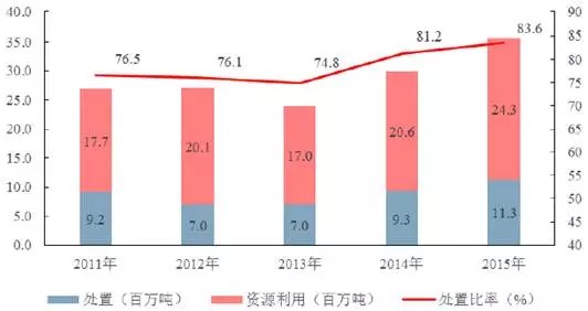 目前,我國工業(yè)危廢處理行業(yè)整體現(xiàn)狀表現(xiàn)為綜合利用水平較高,無害化水平較低,不同細分行業(yè)表現(xiàn)又有所差異。相對來說,資源化利用由于能夠回收資源價值,經(jīng)濟性較高,產(chǎn)生危廢的企業(yè)還能通過出售危廢獲得收入,因此發(fā)展較快也較為充分。而無害化處置技術復雜、處理難度高,而且對于產(chǎn)生危廢的企業(yè)帶來較大的成本負擔,發(fā)展較為緩慢,甚至還有大量傾倒丟棄事件發(fā)生。根據(jù)環(huán)保局的統(tǒng)計數(shù)據(jù)顯示,2015年我國工業(yè)危廢產(chǎn)生量達到4220萬噸,同比增長16.13%;綜合利用處置率為83.6%,同比增長2.4%。
