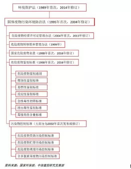 與危廢管理相關的法律包括:《環(huán)保法》、《固體廢物污染環(huán)境防治法》、《可再生能源法》、《節(jié)約能源法》、《循環(huán)經(jīng)濟促進法》、《清潔生產(chǎn)促進法》。除《環(huán)保法》和《固體廢物污染環(huán)境防治法》外其他法律都是在2004年后頒布,《環(huán)保法》修訂已于2014年4月完成,2015年起執(zhí)行。