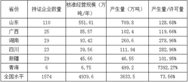 危廢產(chǎn)生量超出核準經(jīng)營規(guī)模的省份(2014年)