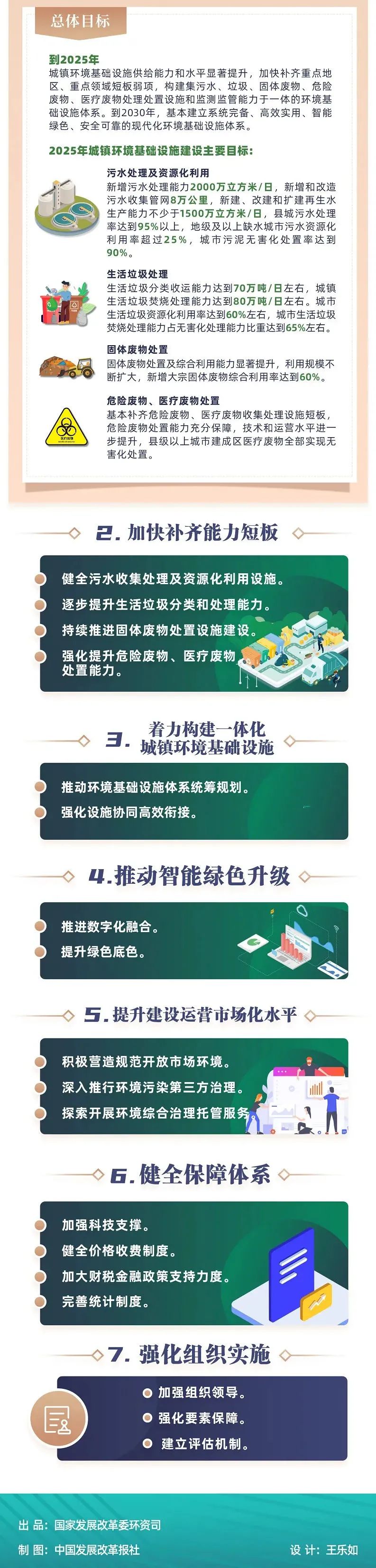 “環(huán)境基礎(chǔ)設(shè)施是基礎(chǔ)設(shè)施的重要組成部分,是深入打好污染防治攻堅(jiān)戰(zhàn)、改善生態(tài)環(huán)境質(zhì)量、增進(jìn)民生福祉的基礎(chǔ)保障,是完善現(xiàn)代環(huán)境治理體系的重要支撐?!眹野l(fā)展改革委相關(guān)負(fù)責(zé)同志在回答記者提問時(shí)介紹,《指導(dǎo)意見》充分考慮現(xiàn)有城鎮(zhèn)環(huán)境基礎(chǔ)設(shè)施工作基礎(chǔ)上,提出到2025年,城鎮(zhèn)環(huán)境基礎(chǔ)設(shè)施供給能力和水平顯著提升,加快補(bǔ)齊重點(diǎn)地區(qū)、重點(diǎn)領(lǐng)域短板弱項(xiàng),構(gòu)建集污水、垃圾、固體廢物、危險(xiǎn)廢物、醫(yī)療廢物處理處置設(shè)施和監(jiān)測監(jiān)管能力于一體的環(huán)境基礎(chǔ)設(shè)施體系;到2030年,基本建立系統(tǒng)完備、高效實(shí)用、智能綠色、安全可靠的現(xiàn)代化環(huán)境基礎(chǔ)設(shè)施體系的總體目標(biāo)。明確到2025年新增污水處理能力2000萬立方米/日、生活垃圾分類收運(yùn)能力達(dá)到70萬噸/日左右、新增大宗固體廢物綜合利用率達(dá)到60%等多項(xiàng)具體目標(biāo)。